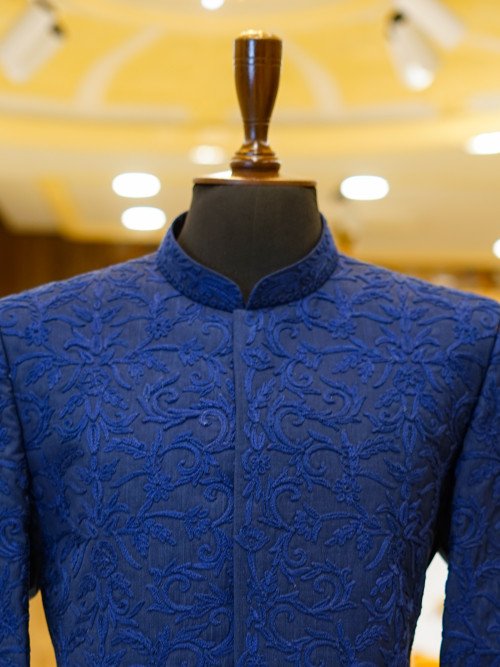 Exude regal charm in this blue Prince Coat, richly detailed with full embroidery.