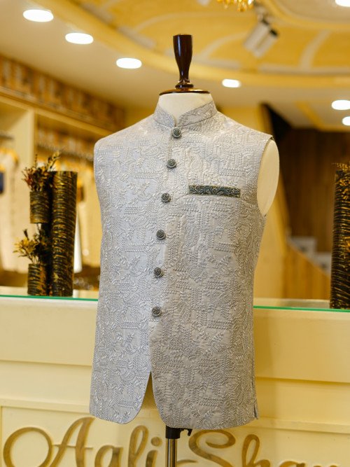 Sophisticated grey waistcoat adorned with detailed embroidery.