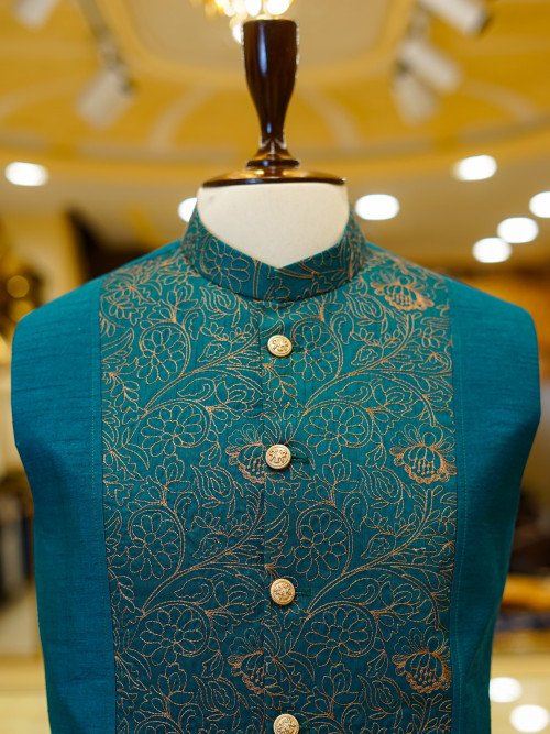 Stylish waistcoat featuring elegant half embroidery for a balanced look.